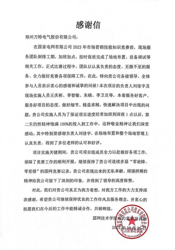 2023年10月,國家電網(wǎng)公司2023年市場營銷技能知識競賽在國網(wǎng)技術(shù)學(xué)院落下帷幕。在這場盛大的賽事中,我公司以卓越的產(chǎn)品性能和精準(zhǔn)的服務(wù)支持,保持了產(chǎn)品“零差錯(cuò)、零故障”運(yùn)行,贏得了業(yè)界和評委們的一致好評。