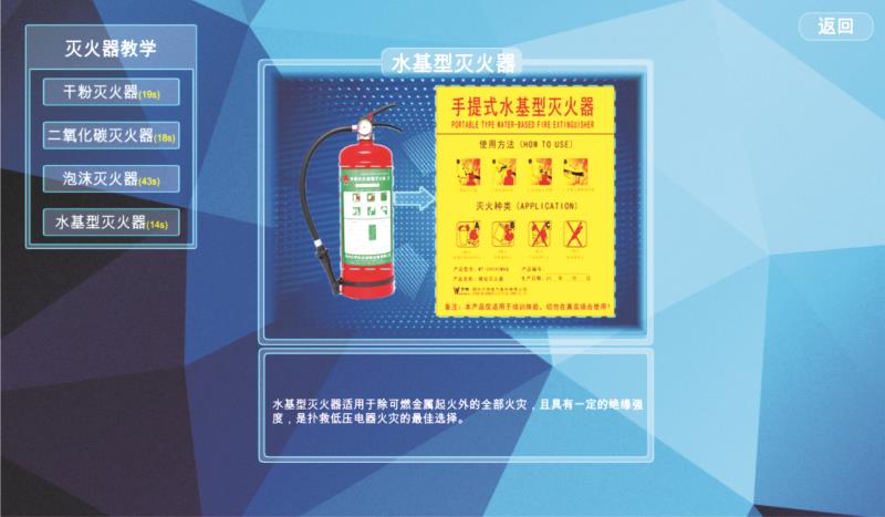 虛擬滅火體驗實(shí)訓(xùn)系統(tǒng)采用公司自主研發(fā)的動作識別系統(tǒng),3D 虛擬現(xiàn)實(shí)、無線通信等多種先進(jìn) 技術(shù)手段。該系統(tǒng)分為消防教學(xué)、模擬演練、隱患排查三大部分。虛擬滅火體驗實(shí)訓(xùn)系統(tǒng)配置 多種檢測、評測模塊,通過對滅火器狀態(tài)的數(shù)據(jù)采集實(shí)現(xiàn)整個滅火流程的測評,達(dá)到自動檢 測、自動判斷、自動評分的效果。
